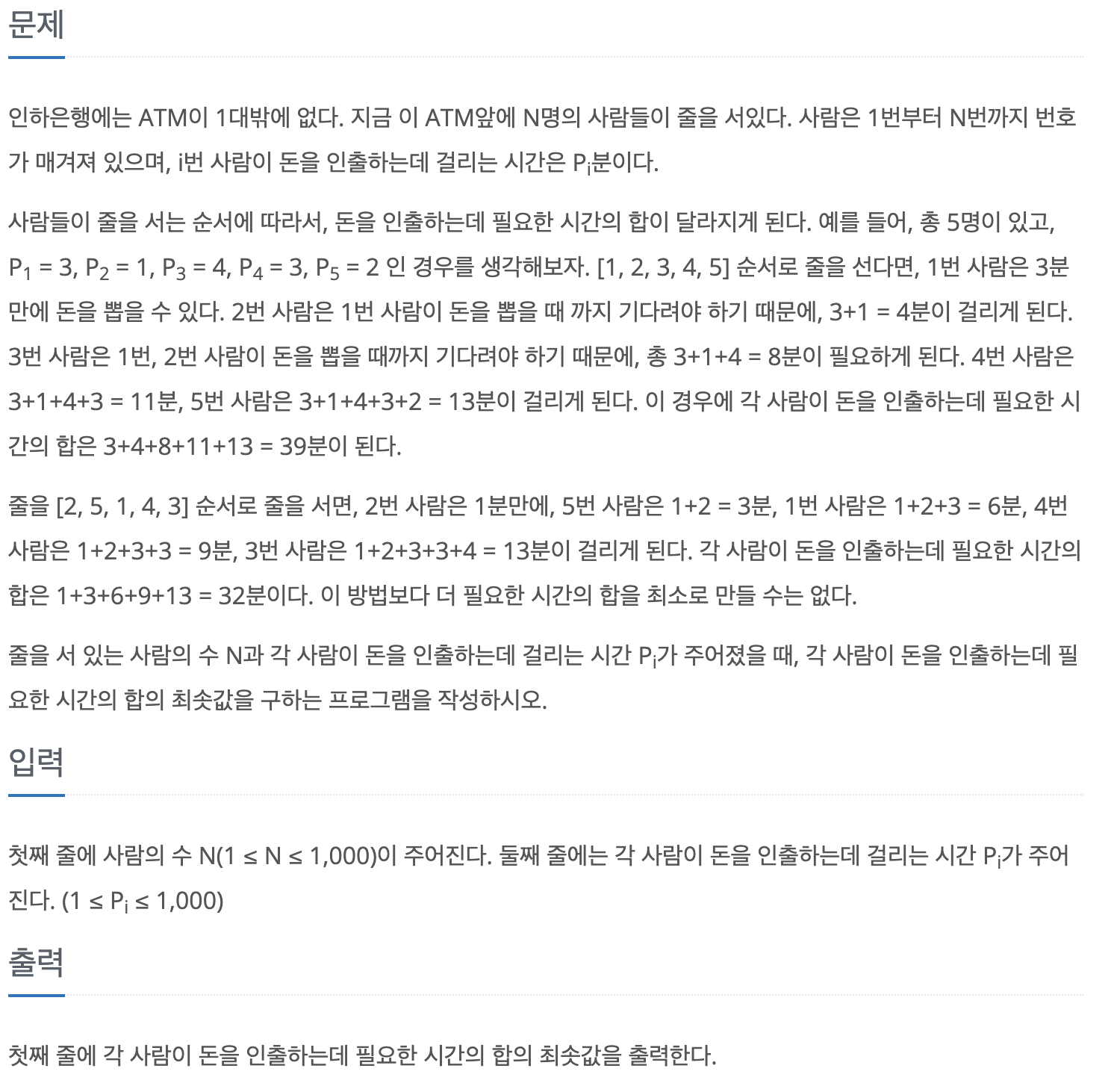 ATM 문제에서는 1번으로 ATM을 사용하는 사람이 N번 사용시간이 더해지고, 2번 사람은 N-1번 사용시간이 더해지고,,,, N번 사람은 1번 더해지기 때문이다.